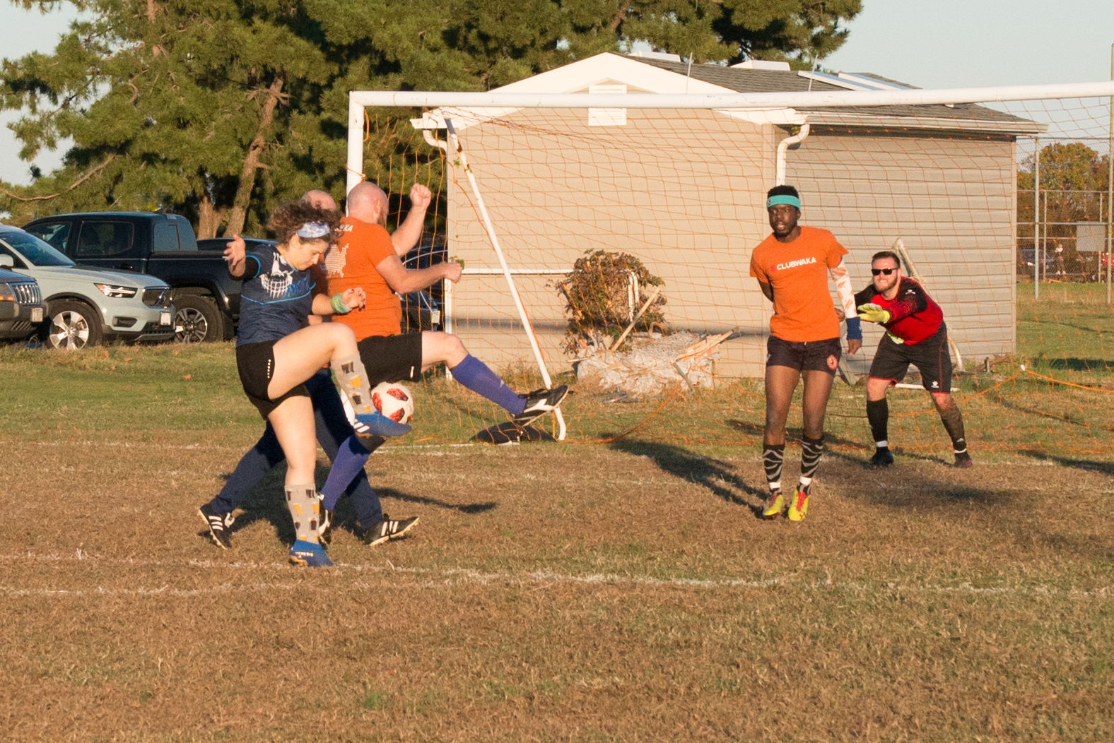 Tiffany Gaidos of Misfits looks to get a shot off against an unfortunate Paul Ilori who got his arm cut off LARPing and Erik Halverson pretending to be a blind man playing goalkeeper.